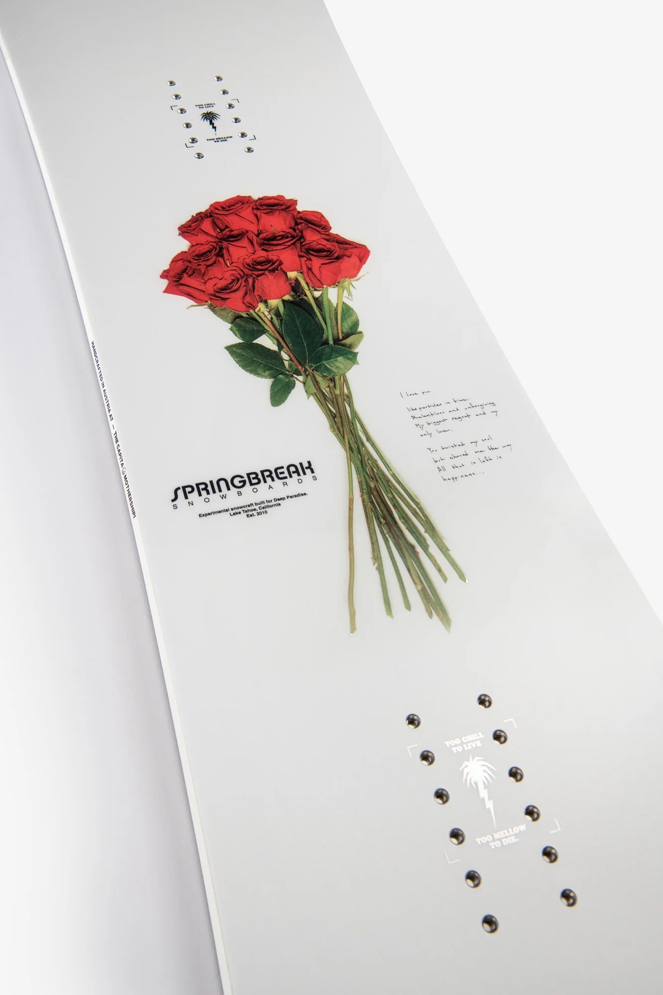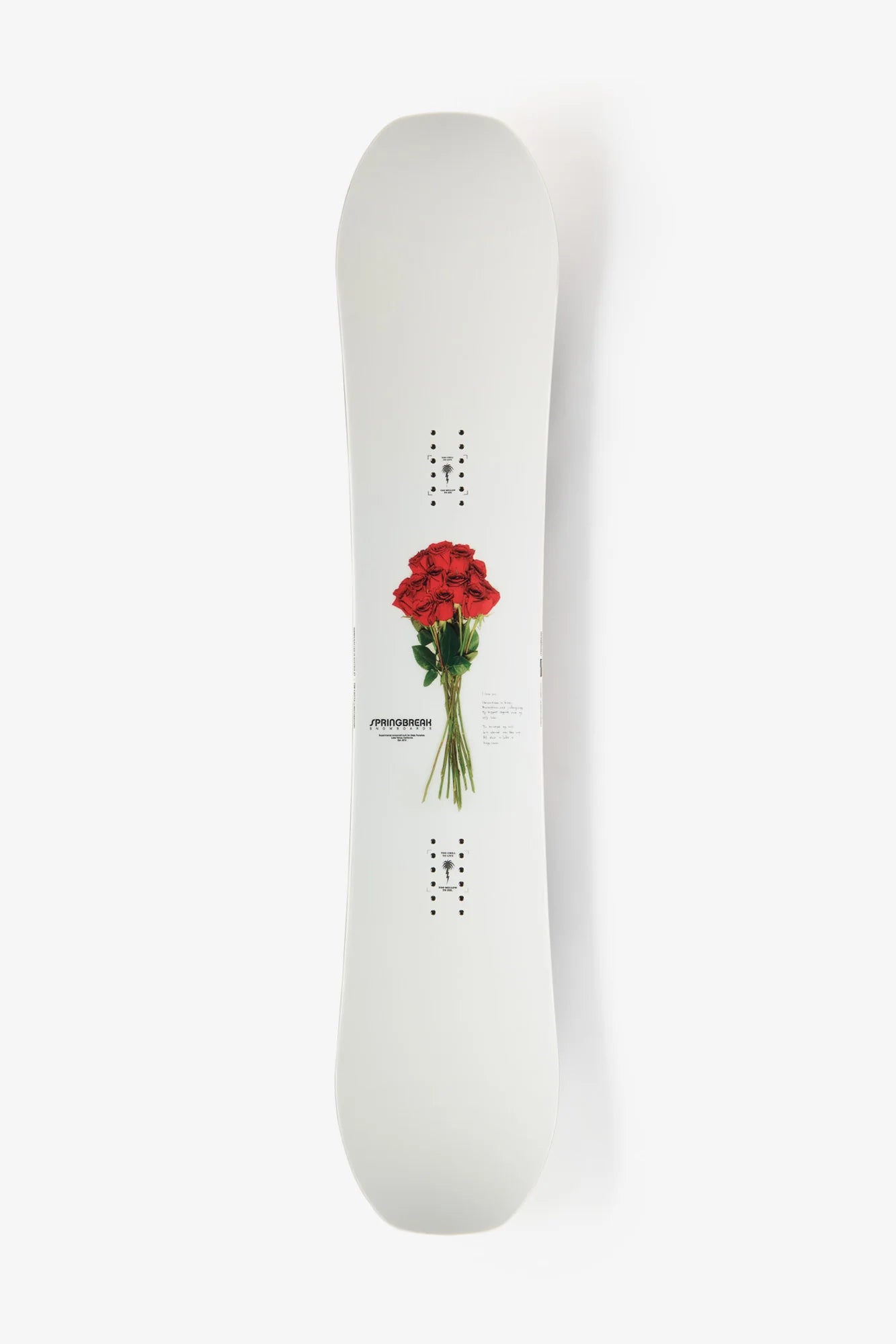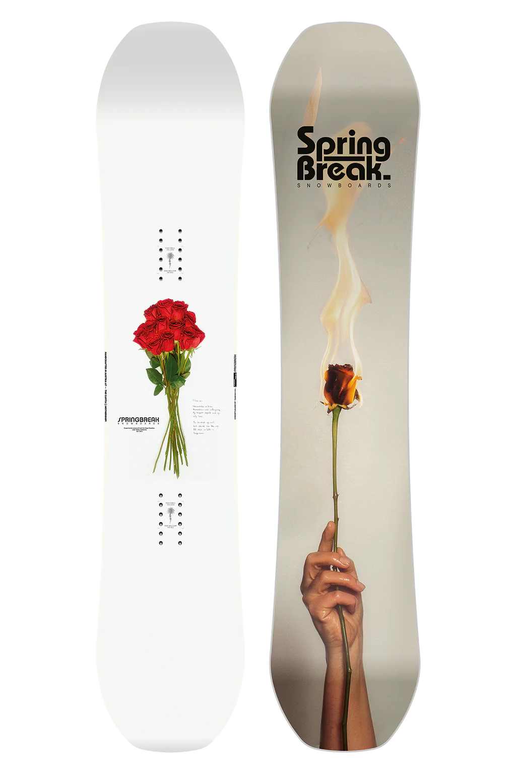 This ain't no business-in-the-front and party-in-the-back type product. It's all business and all party, and it's like that all the time. With a rarely seen symmetrical approach to party boarding, we present you with the Spring Break Powder Twin. Yep, it looks like a twin-tip park board but guess what? It retains many of the geometric theories that have made Spring Break Snowboards legendary in powder—and on the corduroy.