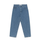 Semi-baggy denim trousers with straight legs and a relaxed fit. Made from 100% cotton denim with a heavyweight 435 gsm feel in a classic Mid Blue wash. Detailed with embroidery on the change pocket, a woven label on the waist, a YKK zipper, and a custom YKK button.