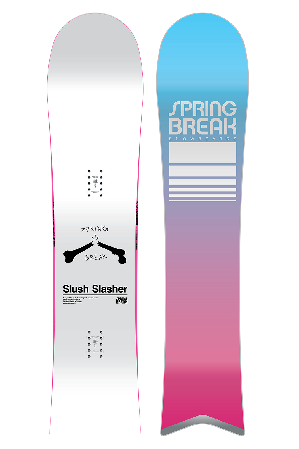 The Slush Slasher is the playful mini-park and powder ripper that changed the game. This innovative short-board rails turns on groomers, transitions, and in the park, and it’s as fun on jibs as it is in the deep stuff. This board is sure to change your perspective on any terrain and put a smile on even the grumpiest skeptics. The elongated nose plows over anything in its path, while its Vacation Tail lets you put these snow sharks on cruise control. With the Slush Slasher, the world is your seven-day weekend.